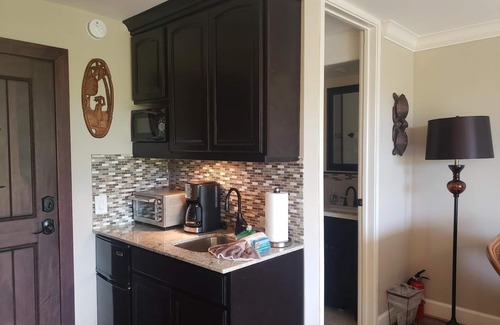 On the other hand, the "OHANA" Studio (Side B) provides a cozy Queen-size bed, an expertly designed kitchenette, and its own intimate lanai where you can savor delightful garden views. This kitchenette is equipped with essentials including a refrigerator, coffee pot, toaster oven, single electric burner, rice cooker, and BBQ utensils. Similar to Side A, Side B also features a stylish walk-in shower. The laundry facilities are conveniently located in the foyer.