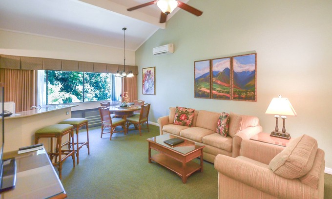 Located on the breathtaking North Shore of Kauai, Princeville, Hawaii, offers visitors a serene escape filled with stunning landscapes and luxurious amenities. This picturesque city is renowned for its lush greenery, dramatic cliffs, and beautiful beaches, making it a top destination for those seeking a tranquil yet exhilarating getaway. Among the highlights is your ideal accommodation, featuring air conditioning both in the bedroom and living room, a fully equipped kitchen, and access to an outdoor pool and hot tub—all set within a family-friendly resort adjacent to the Makai Golf Course. Just a five-minute drive from the Princeville Shopping Center and a short ten minutes from the world-famous Hanalei Bay, this location is perfect for blending relaxation with local adventure.