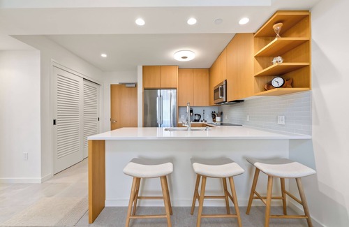 Inside, the space is calm and sunlit, with sleek furnishings, a fully equipped kitchen, and in-unit laundry for your convenience. Whether you're prepping poke bowls or relaxing after a beach day, everything feels effortless here. The king bedroom includes an ensuite bath, while oversized windows frame city or ocean glimpses that never get old.