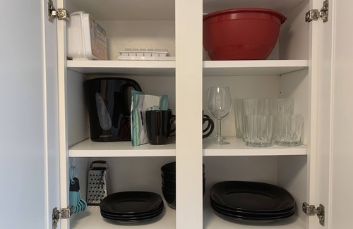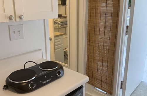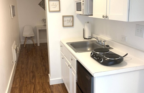 The studio features a comfortable queen-sized bed, cable TV, and high-speed Internet to stay connected during your stay. A small dining area invites you to enjoy meals in, while the kitchenette is equipped with a mini fridge, microwave, coffee maker, and all the essentials needed for preparing quick bites.