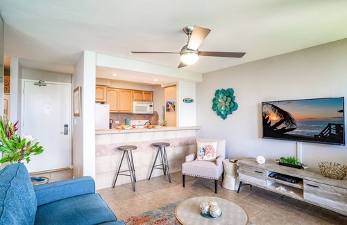 Step into a luminous and spacious 1-bedroom condo featuring a king-size bed, a full-sized dresser, ample closet space, and an inviting sitting nook with spectacular views of both the ocean and mountains. With a brand new flat-screen Smart TV, digital cable in the living room, and complimentary high-speed wireless internet access, you'll feel right at home while enjoying all the modern conveniences.