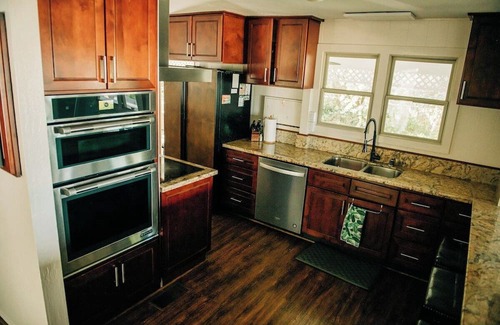 - Kitchen features a refrigerator, dishwasher, oven, microwave, and coffee maker