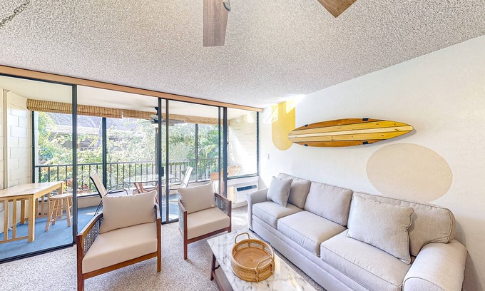 Upon returning to your vacation rental, unwind in the serene Hawaiian ambiance adorned with surfboards and thoughtful decor. The kitchen is fully equipped, allowing you to prepare delicious meals at your leisure. Kick back on the cozy couch and enjoy your favorite movies or shows with streaming options available, or utilize AirPlay for a seamless experience.