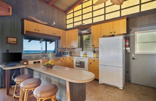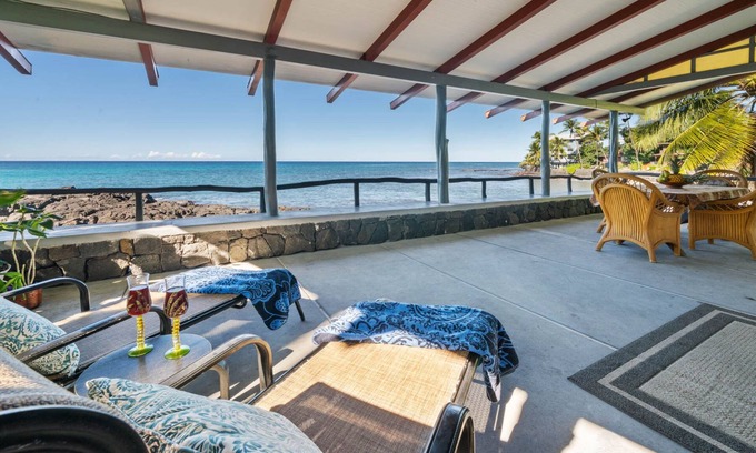 Immerse yourself in the tranquility of this delightful beachfront in Sunny Kona, perfectly situated on a serene oceanfront property just south of the bustling center of Kona. This vintage two-bedroom, two-bath cottage is designed for comfort and relaxation, featuring a spacious covered lanai that invites you to absorb the island's beauty. Adorned with classic Hawaiiana furnishings, the home also boasts a grassy yard and convenient parking.
