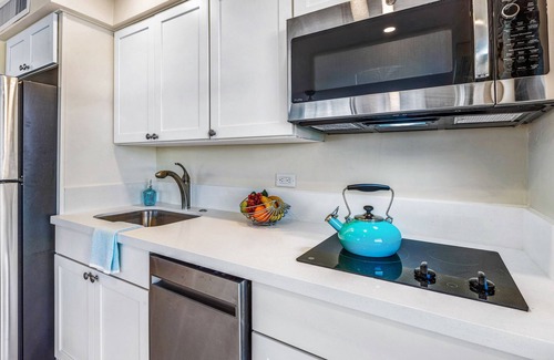 Your kitchen comes equipped with modern stainless steel appliances, ideal for preparing breakfast or lunch at your leisure. It includes all the essentials like a microwave, cookware, utensils, toaster, and coffee maker. Enjoy your meals while taking in the scenic views from the dining table, or relax on the lanai with your favorite refreshments. The wrap-around lanai provides surprising vistas of the ocean, making every moment spent here truly special.