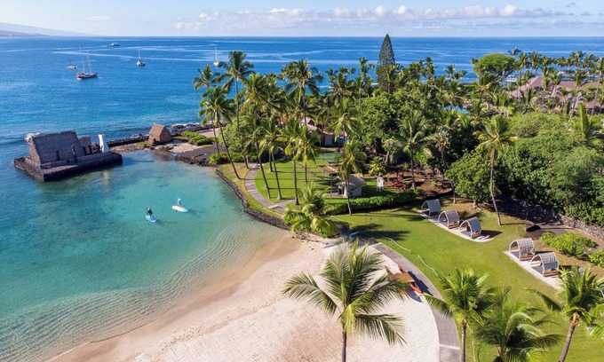 Your stay at the Courtyard by Marriott King Kamehameha's Kona Beach Hotel places you in an ideal location to experience the best that Kailua-Kona has to offer. Just steps away from the beach, you can bask in the sun or indulge in a rejuvenating treatment at the hotel's full-service spa. Enjoy dining at one of the hotel's two restaurants after a day filled with activities such as snorkeling, kayaking, or visiting the nearby Hulihee Palace. For those seeking recreation, the hotel features an outdoor pool, tennis courts, and a fitness center, ensuring your trip stays active and exciting. Discover the surrounding natural beauty and cultural attractions while enjoying the comforts of this premier accommodation option, making it the perfect choice for your stay in Kailua-Kona.