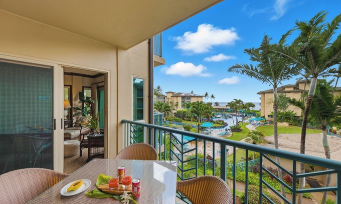 Situated centrally along the Royal Coconut Coast, you'll find the beach, restaurants, shops, and the scenic Kaua’i Bike Path just a short stroll away. This stunning waterfront resort is perfect for witnessing mesmerizing sunrises and full moons over the ocean.