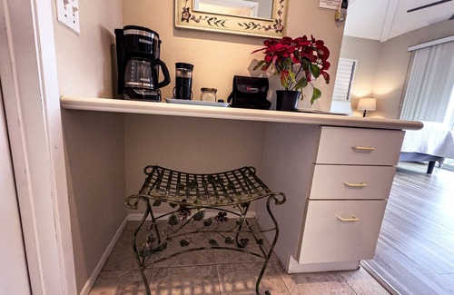 Inside, comfort reigns supreme with king-sized beds and 42-inch Smart TVs offering entertainment during your stay. The kitchen includes essential amenities like a sink, countertop, medium-sized refrigerator, microwave, electric frying pan, toaster oven, and various dishware—ideal for whipping up quick snacks. Please note that there are no stoves or ovens available.