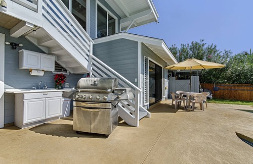 The beach at He'eia Bay boasts unique black lava rock formations, interspersed with stunning white coral and inviting black sand. Each unit comes equipped with spacious lanais featuring lounge chairs and dining sets perfect for four, along with large gas BBQs for those delightful outdoor meals.