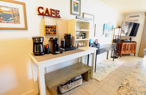 Your main bedroom features a luxurious king-size bed, flat-screen TV, and air conditioning for those warm tropical nights. The living area, equipped with a separate A/C unit, boasts a new queen sofa sleeper for extra guests. You will find a fully stocked kitchen ready for your culinary adventures, along with a washer and dryer for your convenience. The property also includes snorkel gear, boogie boards, books, games, and ceiling fans for both indoor and outdoor comfort. For remote work or dining, there's a convertible coffee table that accommodates up to four people.