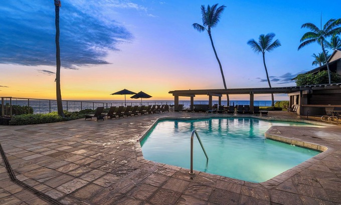 Each bedroom has its own private lanai; one overlooks the ocean and swimming pool, while the other offers captivating ocean vistas. The unit is decorated with a contemporary Hawaiian flair, complemented by ceiling fans and air conditioning to maintain a comfortable atmosphere throughout your visit.