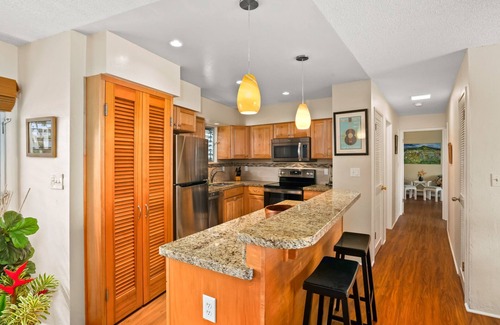 Your retreat is elegantly furnished with island-themed decor, creating a warm and inviting atmosphere. Embrace the gentle breezes of this Hawaiian paradise as the property prioritizes natural ventilation, foregoing air conditioning for a truly authentic experience. The open-concept kitchen features beautiful granite countertops and modern stainless steel appliances, making it perfect for memorable in-home dining experiences.
