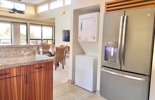 Explore the community's inviting swimming pools, hot tub, fitness room, and tennis courts—all available on a first-come, first-served basis. Central air conditioning keeps you comfortable throughout, while a community BBQ grill is there for your culinary ventures. Each unit comes equipped with a washer and dryer, cable TV, and Wi-Fi for your convenience. The fully stocked kitchen includes cookware, utensils, and appliances like a drip coffee maker, blender, and rice cooker to help you feel right at home during your visit.