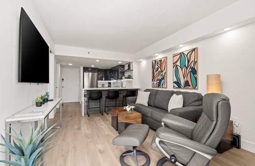 Modern Waikiki suite, fully remodeled in 2025, with an oversized 120-sqft private lanai and beautiful marina and ocean views. Highlights include a RARE and convenient in-unit washer/dryer and FREE on-site self parking for 1 vehicle. Enjoy your Hawaiian vacation at the Ilikai, the iconic destination made famous by Hawaii Five-O. Perfect for couples and small families! 4-person max.