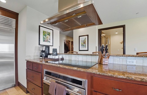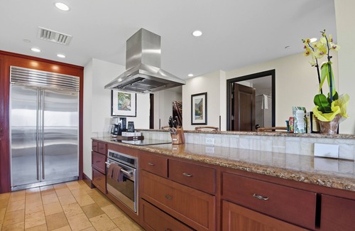 This elegant suite is designed to comfortably host up to six guests, featuring a king bed, a queen bed, and a queen sleeper sofa. The stylish decor has been expertly curated by the renowned interior design firm Philpot's and Associates. The kitchen is a culinary delight, equipped with a Wolf glass cooktop and oven, a Sub-Zero refrigerator, a GE profile microwave, Fisher Paykel dual dishwasher drawers, granite countertops, and African Mahogany cabinets. Additionally, you will find three full bathrooms adorned with exquisite Peruvian Travertine stone.