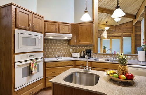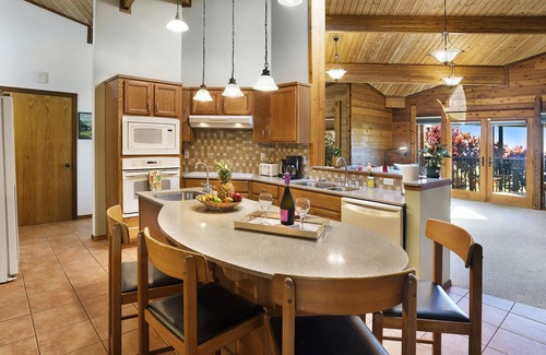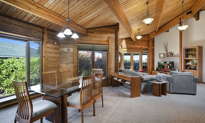 Spanning 2,000 square feet, this exquisite vacation house showcases sturdy solid cedar timbers that are four inches thick. Both the interior and exterior are thoughtfully clear-stained, emphasizing the striking beauty of the wood's natural color and grain pattern. You will find refreshing central air conditioning throughout this spacious three-bedroom, 2.5-bath home. Two bedrooms are furnished with queen beds, while the third bedroom features two twin beds. Additionally, a cozy daybed located next to the kitchen can function as a fourth bedroom. Enjoy the convenience of a master bathroom, alongside a full bathroom and a half-bath.