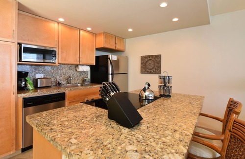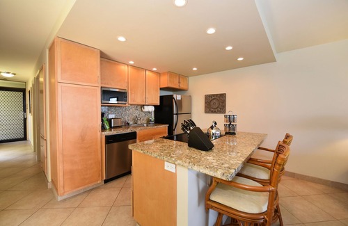 This beautifully renovated corner suite features expansive windows that invite abundant natural light and refreshing trade winds. The fully equipped kitchen boasts full-size stainless-steel appliances, granite countertops, and an expansive island, making it perfect for preparing delightful home-cooked meals.