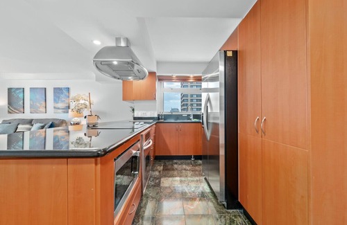 Relax on two private lanais or enjoy panoramic views of the Ala Wai canal, Ko'olau Mountains, and the Pacific Ocean. With central air, complimentary high-speed internet, and a fully equipped kitchen, your stay is as convenient as it is luxurious.