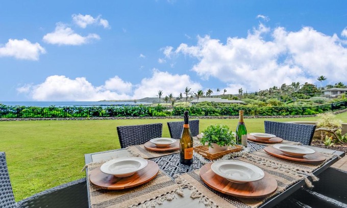 This spacious vacation home boasts breathtaking sea views from its balcony, along with essential amenities including one bedroom, a cozy living room equipped with a cable flat-screen TV, a fully stocked kitchen, and a bathroom featuring both a bath and shower. Fresh towels and bed linens are provided for your comfort, and you'll find an inviting outdoor dining area perfect for enjoying meals in the warm Hawaiian breeze.