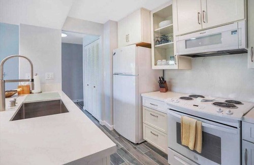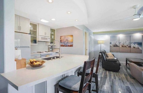 Your accommodation spans 810 square feet and has been tastefully remodeled in serene shades of grey and white. It boasts an airy, open layout complemented by grey porcelain tile, Italian marble Silestone countertops, and sleek white kitchen appliances. With air conditioning units in both the main living area and bedroom, as well as two large wall-mounted TVs, you will enjoy every moment of your time here. The living space is adorned with local artwork and showcases expansive floor-to-ceiling windows that invite natural light while framing picturesque views of the resort's fountains, palm trees, and the tranquil ocean.