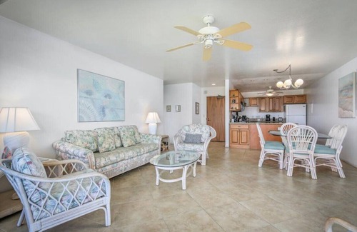 This unit offers patio furniture, a private gas grill, and roll-down sun shades to ensure a cool and comfortable experience during your stay. Accessing the ground level is easy with just one flight of stairs from the parking area. Once inside Unit B-107, you'll find a spacious living room designed for convivial gatherings, complemented by a fully stocked kitchen equipped with all the essentials you’ll need.