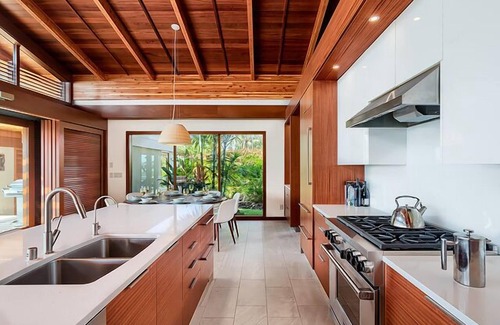 The estate boasts four generous air-conditioned bedroom suites, each featuring king-sized beds, luxurious bathrooms, and private lanais. Every room is outfitted with flat-screen TVs and adorned with exquisite hotel and custom bedding, ensuring a restful night's sleep.
