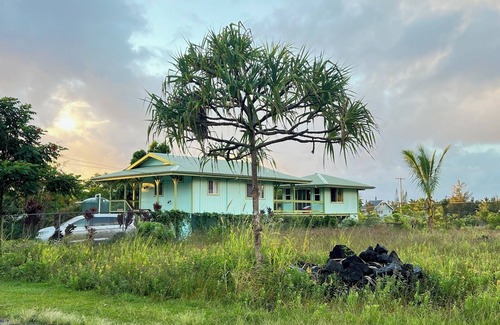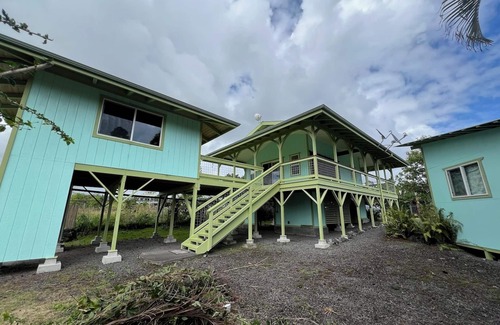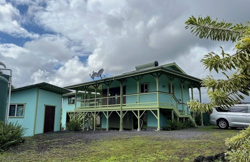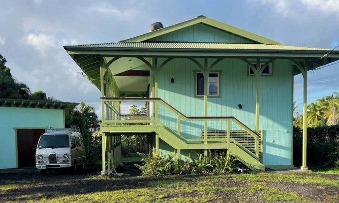 This charming, elevated home in Pahoa, Hawaii, blends modern comfort with island charm. Painted in soft green hues that complement the lush tropical surroundings, this rental is perfect for a relaxing escape.