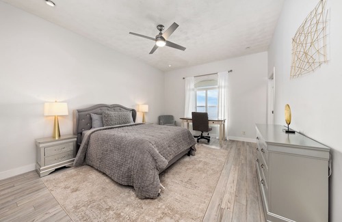 The accommodation includes four inviting bedrooms: the master bedroom offers two queen beds along with a spacious bathroom and walk-in closet; two additional bedrooms each come with a queen-size bed; and another bedroom is furnished with two standard-size bunk beds, ensuring comfort for everyone.