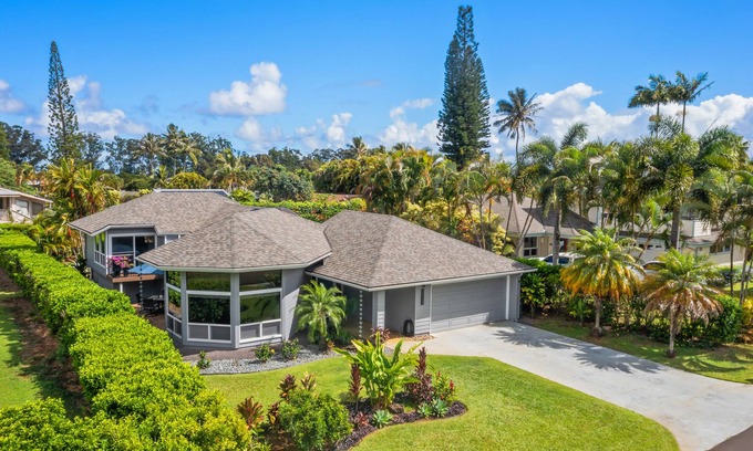 This upscale residence features 3 elegantly appointed bedrooms (King, Queen, Full) along with 2 full bathrooms, nestled on a tranquil street within the esteemed Princeville resort community. Its prime location allows for leisurely strolls along the Princeville path, visits to the bustling Saturday Princeville Farmers Market, and access to community parks equipped with fun jungle gyms for the little ones. Whether you're looking to shop, dine, or play golf, everything is conveniently nearby.