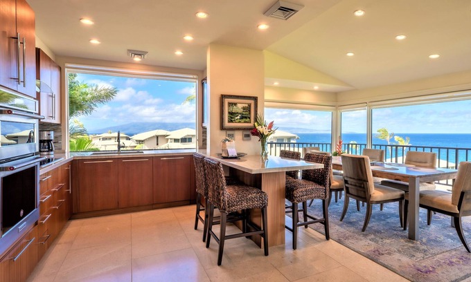 Step into paradise at Hale I Ke Kai, which translates to 'Home Towards The Sea' in Hawaiian. You will be captivated by the stunning ocean vistas visible from every room in this luxurious villa located in Kapalua. With its impressive 180° panoramic views of the Pacific Ocean, neighboring islands, and the scenic coastline of Maui, this accommodation offers a unique experience that truly stands out.