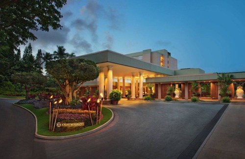 The beautifully landscaped grounds feature magnificent architecture, tranquil courtyards, striking wall art, soothing koi ponds, cascading waterfalls, ancient Hawaiian artifacts, and inviting outdoor seating areas surrounded by lush tropical plants and scenic walking paths.