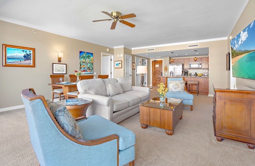 The well-appointed Kaanapali suites—Konea 303, Konea 304, and Konea 305—boast spectacular ocean views and prime interior courtyard locations, showcasing the golden sands of Kaanapali North Beach. With a total of 3880 sq ft of living area, this accommodation comfortably accommodates up to 18 guests with six king-sized beds and three queen-sized convertible sofa sleepers.