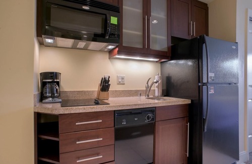 Your villa comes complete with a gourmet kitchenette, showcasing elegant granite countertops and essential appliances including a two-burner stove, an apartment-sized refrigerator, a mini dishwasher, a sink, and a microwave. You'll also find a coffee maker and toaster for your convenience. Unwind in the stylish bathroom, which is equipped with a glass shower and a soothing air bubble jacuzzi tub. Enjoy home-like comforts with a flat panel TV and the indulgent Heavenly Bed, ensuring a restful stay.