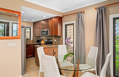 The open-plan living room, dining area, and adjoining oceanfront lanai provide ample space for unwinding after a day of island adventures. Revel in spectacular views of the ocean, witness breathtaking sunrises and sunsets, and keep an eye out for playful dolphins and majestic whales during their seasonal visits. The fully stocked kitchen ensures you can easily prepare your favorite local dishes anytime.