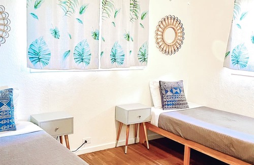 - Bedroom #1: Furnished with two twin beds and ceiling fans for comfort.