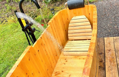 An outdoor furo hot tub, with seating for two, rejuvenates you at the end of your day after touring. A Japanese furo (風呂), also known as an ofuro, is a traditional Japanese bathtub designed for soaking and relaxation rather than washing. Unlike Western bathtubs, a furo is deeper and made of cypress wood which retains heat well.