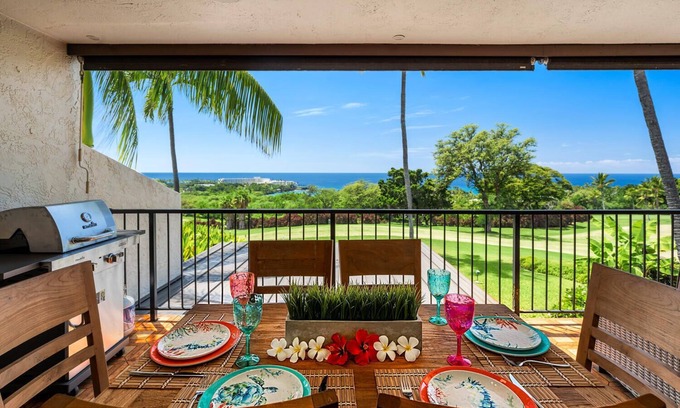 As you step onto the lanai, you will be captivated by the breathtaking views overlooking the picturesque Kona Country Club's 18th fairway. It’s the perfect spot to unwind after a day of exploring the enchanting landscapes of Kailua-Kona or simply savoring the beauty of Hawaii.