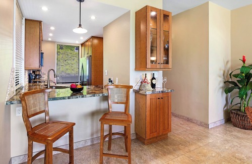 Hale Un Lugar Celestial features 1 bedroom and approximately 1,118 square feet of living space, which includes an additional 125 sq ft gained from enclosing a balcony in the master suite. The outdoor lanai adds another spacious 379 sq ft for you to enjoy. As an end unit, you’ll appreciate the convenience of a ground floor entrance, complemented by new bamboo cabinets and stylish granite countertops in the remodeled kitchen.