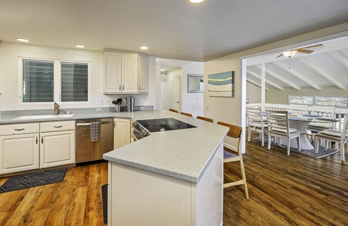 The heart of Hale Malia is its expansive kitchen, equipped with modern stainless steel appliances and a generous central island with bar seating for four. This inviting space is perfect for preparing delicious meals or entertaining friends and family. Just steps away, the dining area boasts a large table that comfortably seats six, allowing everyone to enjoy meals while soaking in the incredible views.