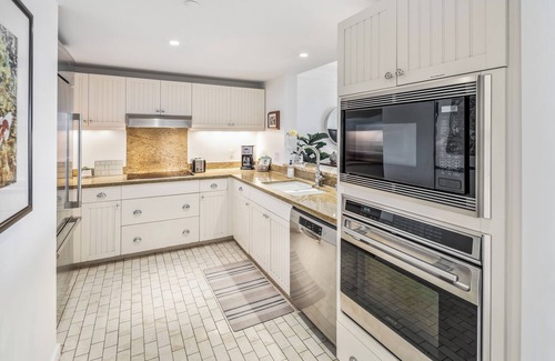 The master suite is a true haven, featuring a comfortable king-size bed, walk-in closet, and a spa-like bathroom complete with a deep soaking tub, separate shower, and dual-sink vanity that enhances your relaxation experience. The additional two bedrooms come furnished with queen-size beds, while a full-size pull-out couch in the living room accommodates extra guests, making it an exceptional choice for families or groups.