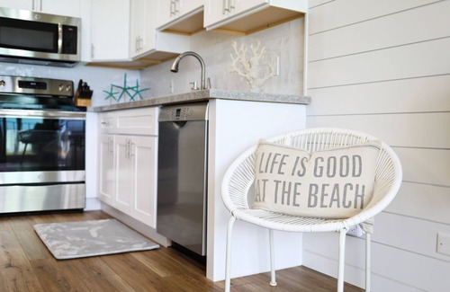 Retreating to your bedroom after a day basking in the sun, you'll find a meticulously crafted space complete with a king bed. Opt to leave the barn door open to let the soothing sounds of the ocean in, or close it for a little extra privacy. The fully equipped kitchen boasts brand new stainless steel appliances and elegant quartz countertops, along with a cozy breakfast bar perfect for morning meals. The living area features a comfortable memory-foam pull-out sofa positioned perfectly in front of a 50” Smart TV for your entertainment.