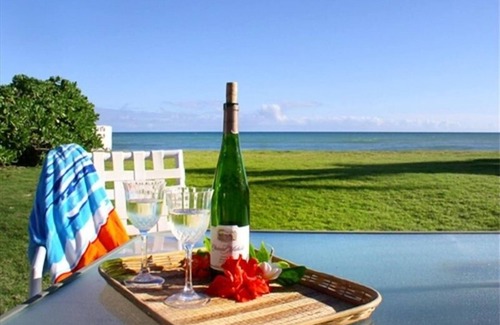 The lush lawn seamlessly transitions to the Pacific Ocean, providing a serene space for reading, sunbathing, or refreshing yourself with a drink while soaking in the salt air and tranquillity. The soothing naupaka hedge adds to the charm.