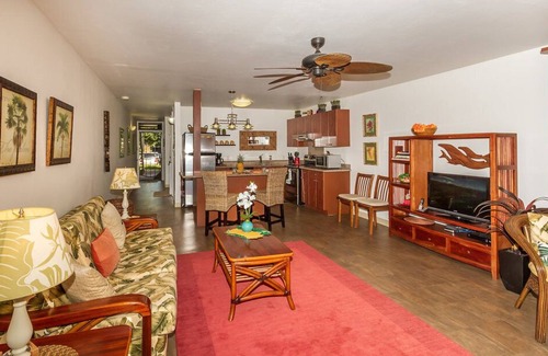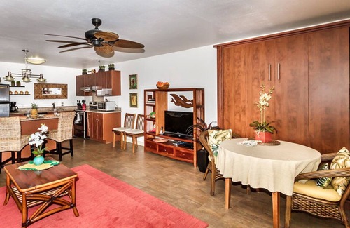 The inviting living room comes equipped with a queen-size Murphy bed that accommodates two guests, all while opening up to a serene grassy area that overlooks the meticulously maintained grounds of Kuilima Estates. Your restful nights are guaranteed in the comfortable king-size bed located in the bedroom, which includes its own air conditioning unit and private bathroom with a shower. Additionally, the living area also has air conditioning, ensuring your stay remains cool and comfortable.