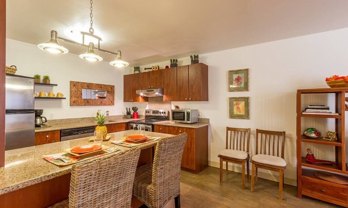 This ground-level unit features one spacious bedroom and two full baths at Kuilima Estates East. Just a brief stroll from Turtle Bay Resort, this home is perfectly positioned near the ocean. The open-concept kitchen flows seamlessly into the living area, showcasing new stainless steel appliances, elegant granite countertops, and stylish cabinets. Whether you're an aspiring chef or prefer dining out, you can enjoy preparing meals here.