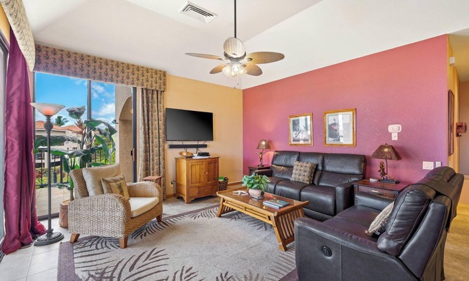 This tropical top floor penthouse offers beautiful resort views and peek a boo ocean views that look towards the Hilton Waikoloa hotel. The Waikoloa Beach Resort features luscious greenery, koi ponds, a shared swimming pool, a fitness room, and BBQ stations to enjoy. Maximum occupancy strictly enforced in accordance with local ordinances.