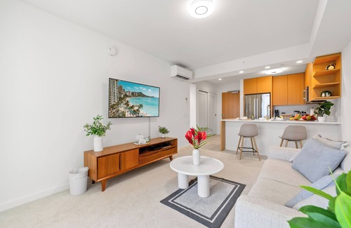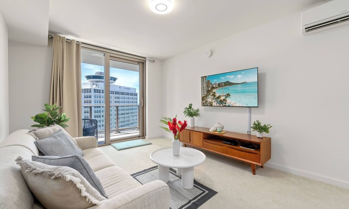 A modern 1BR/1BA retreat perched on the 23rd floor of the brand-new Sky Ala Moana. Designed for comfort and style, this condo blends sleek interiors with sweeping views of Honolulu’s skyline and the Pacific Ocean. Step onto your private balcony to take in panoramic ocean and sunset views or relax in the living room, where a full-sized sleeper sofa, smart TV, and chic island-inspired décor make unwinding easy.