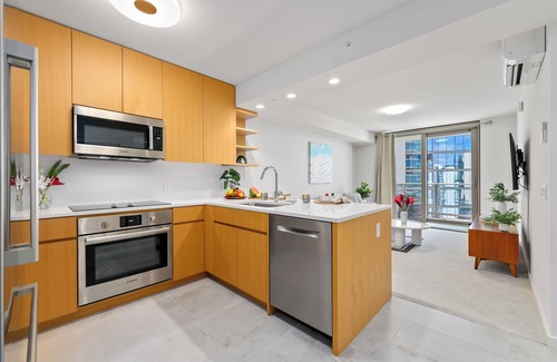 The open layout flows seamlessly into the modern kitchen, complete with counter seating, quartz countertops, and all the essentials for your stay. Retreat to the serene bedroom with a king-size bed and picture windows framing the city and ocean beyond. A spa-inspired bathroom with high-end finishes completes the space, ensuring both relaxation and convenience.