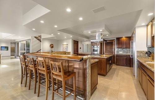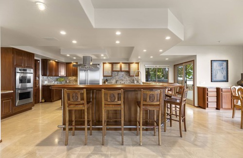 The interior has been thoughtfully designed by local artist Lucky Bennet, boasting recent renovations that showcase island-inspired elements, including LED lighting, custom cabinetry, and rich Koa wood finishes. You will appreciate the long private gated driveway that welcomes you to the main courtyard, complete with a two-car garage, storage space, and an electric vehicle charging station for your convenience.