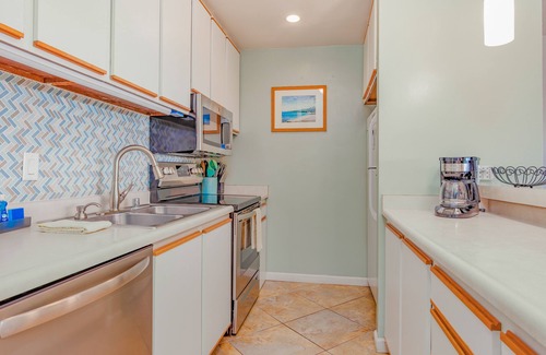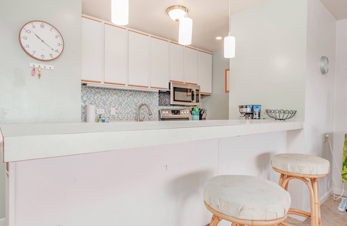 Inside, the condo greets you with a mirrored entryway leading to a bright, airy living space that captures the island’s tropical essence. Enjoy the comfort of air conditioning or slide open the expansive floor-to-ceiling doors to welcome in the delightful breeze. The well-furnished kitchen features modern appliances, a cozy breakfast bar, a glass-top dining table, and a cable TV for evening entertainment. A second TV with Chromecast is available in the bedroom for your viewing pleasure.