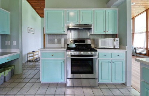 The fully equipped kitchen is perfect for family gatherings, complete with a long wooden dining table, bar, and all necessary appliances for cooking and serving delicious meals. Recently updated with new countertops, flooring, and fans, this kitchen is designed for both function and style.